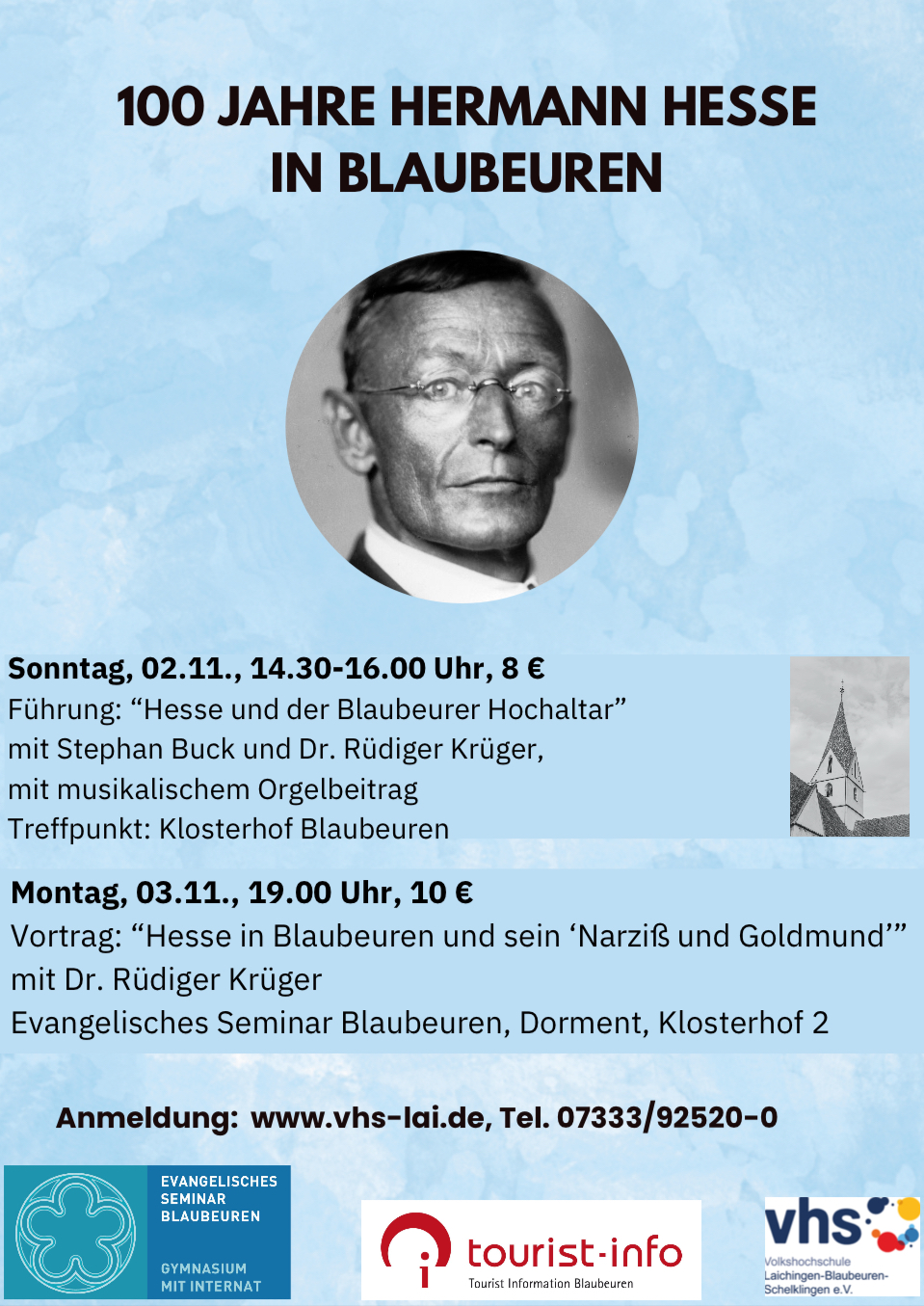 Das Ev. Seminar Blaubeuren, die VHS und die Gästeführer der Tourist-Information erinnern mit einer Klosterführung und einem Abendvortrag im Dorment an diese vor hundert Jahren statt gehabten denkwürdigen Tage des Literatur-Nobelpreisträgers in Blaubeuren: